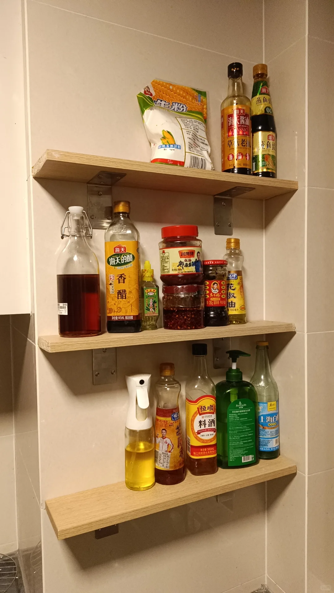 这样就变成了一个非常实用的厨房置物架。可以直接将一些调料品放置在上方,非常的结实,而且还很耐用。