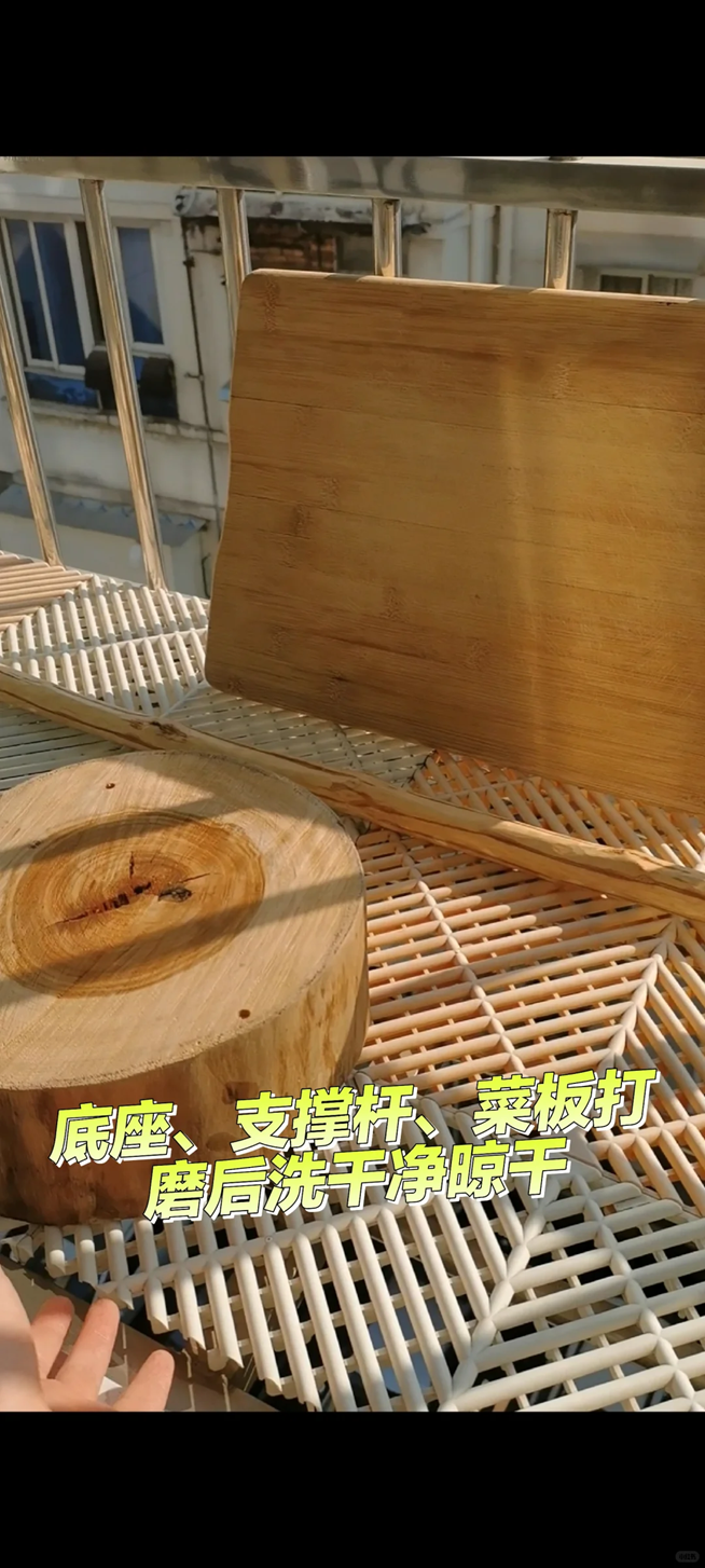 大家家里面已经发霉或者是不想要再用的旧菜板,可以进行一下简单的打磨,再准备一个小的架子,然后将其组装在一起。